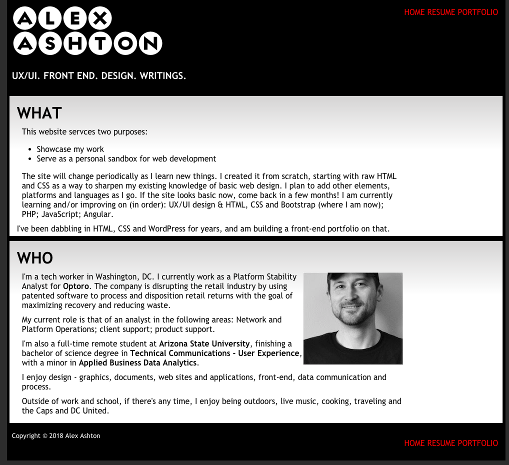 Version 1.0 of Alex Ashton Designs was coded from pure HTML5 and CSS3 using Sublime Text. A bit of JavaScript was tossed in here and there, but at the time, I didn't really understand what it did. The main goal of this version was to brush back up on HTML5 and CSS3.
